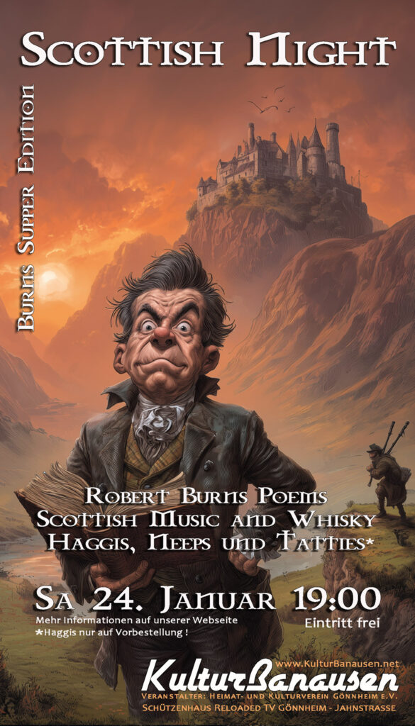 Hinweis: Der aufmerksame Schottland Fan weiß natürlich das Robert Burns am 25. Januar Geburtstag hat. Aber aus organisatorischen Gründen ist es nicht möglich die Veranstaltung am Sonntag Abend durchzuführen.